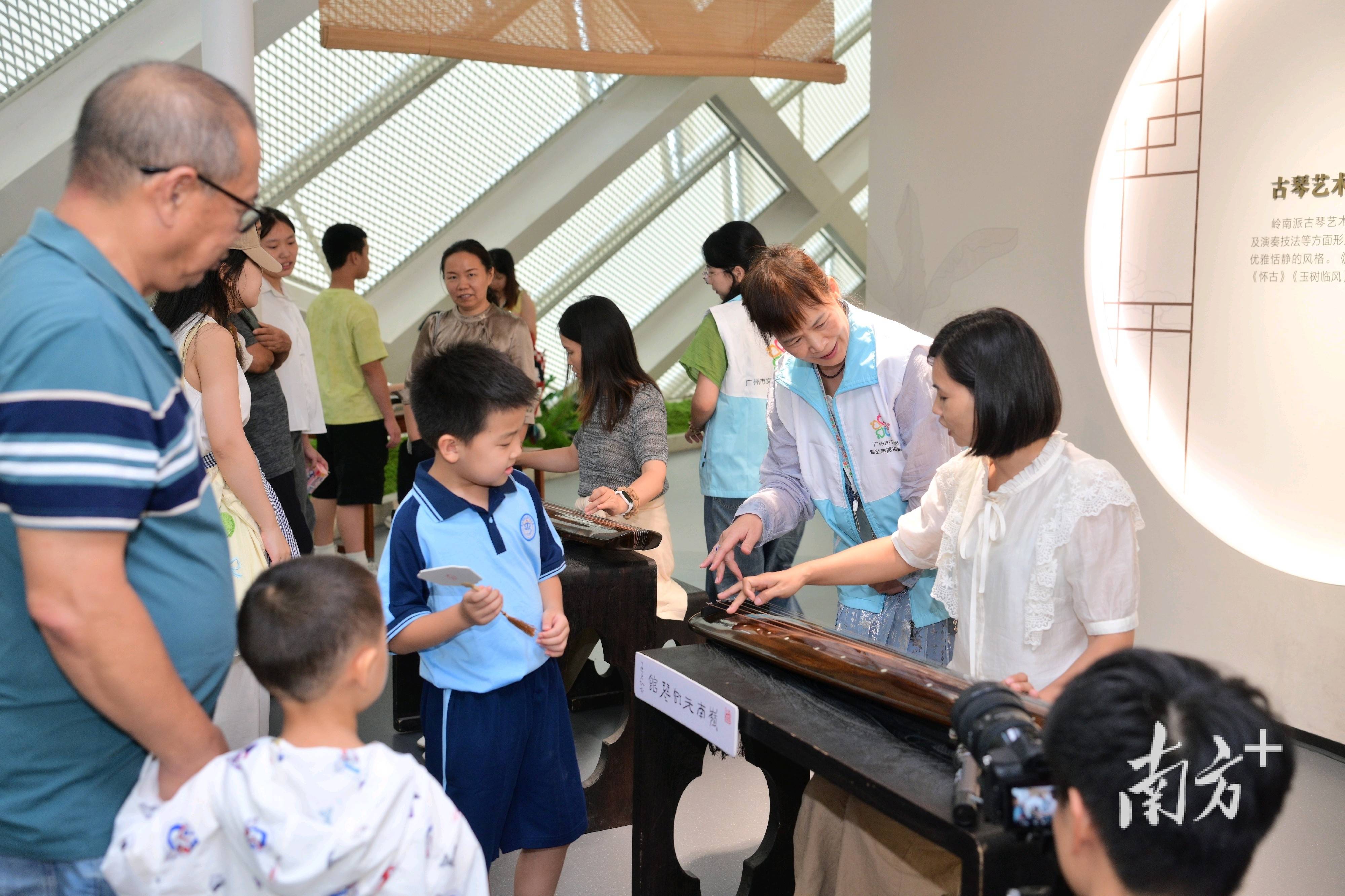 当天白天,省非遗馆三楼物华锦绣展厅古琴展区奏起前音,特邀岭南天虹琴馆团队带来两场预热展演。方寸舞台之上,丝弦轻拨,粤韵悠扬。多名观众在传承人指导下,学习演奏古琴曲《沧海一声笑》,并与传承人合影留念。